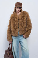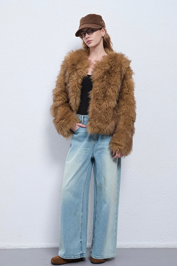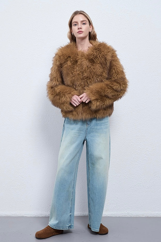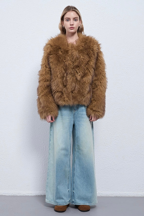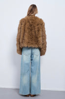 Crafted from eco-friendly faux shearling with a soft suede finish, this short jacket offers a perfect blend of warmth, comfort, and modern style. The relaxed silhouette and flattering V-neck design create a laid-back yet refined look, ideal for layering over seasonal outfits. With its plush texture and effortlessly chic appeal, this piece brings a cozy touch of sophistication to your fall and winter wardrobe.